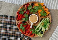 250 г • печеным перцем, томатом, огурцом, красным луком, маслинами на подушке из листьев салата под медово-горчичной заправкой