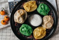 450 г • осетинский пирог закрытого типа в форме круглой лепешки с начинкой из фарша из говядины и свинины с перцем чили и кинзой