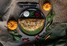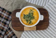 800 г • Салат из свеклы, грецкого ореха и чеснока, сырный крем-суп с грибами, блинчики с куриным жюльеном, домашний хлеб, компот, десерт, сезонные фрукты