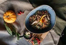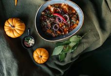 800 г • Салат с говядиной, фасолью и грибами, тыквенный крем-суп с беконом, рубленная куриная котлета с сыром и рисом, домашний хлеб, компот, десерт, сезонные фрукты