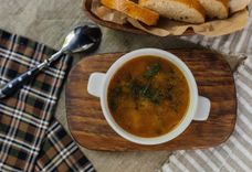 350 г • на основе кваса с добавлением свеклы, огурца, картофеля, моркови, яйца. Подается с чесночным соусом и картофельными дольками