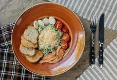 210 г • с каперсами, красным луком, зернистой горчицей, сыром пармезан. Подаем с чиабаттой, рукколой и лаймом