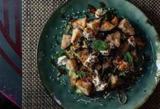 310 г • обжаренные до хрустящей корочки баклажаны, помидоры, йогуртовый сыр, зелень, красный лук, семечки кунжута и подсолнуха, заправка из сладкого соуса чили и кунжутного масла