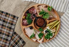 650 г • отварной язык, грудинка, шпик, форшмак. Подаем с гренками из бородинского хлеба, корнишонами, маринованными томатами, хреном, горчицей и зеленью