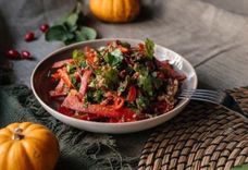 450 г • с обжаренными кабачками, болгарским перцем, кукурузой, шампиньонами, помидорами черри и гранатовым соусом