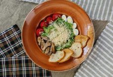 230 г • с помидорами черри, перепелиными яйцами, гренками из французского багета, листьями салата, сыром пармезан и фирменной заправкой Цезарь